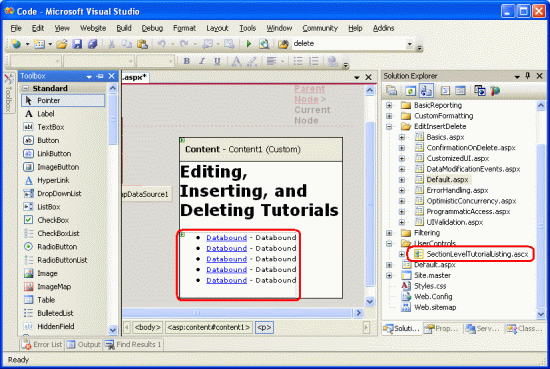 Like in the other folders, Default.aspx in the EditInsertDelete folder will list the tutorials in its section. Recall that the SectionLevelTutorialListing.ascx User Control provides this functionality. Therefore, add this User Control to Default.aspx by dragging it from the Solution Explorer onto the page's Design view.