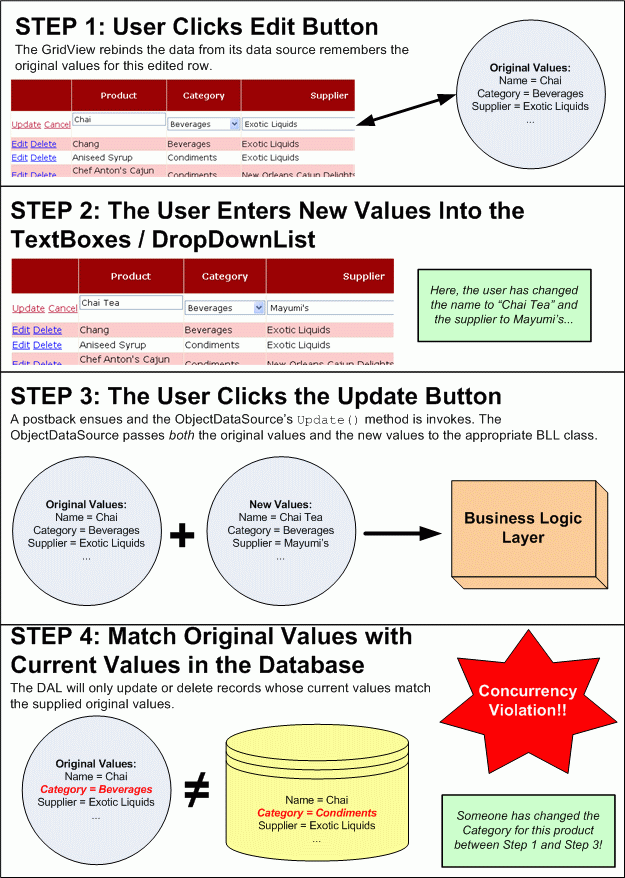 Optimistic concurrency control works by ensuring that the record being updated or deleted has the same values as it did when the updating or deleting process started. For example, when clicking the Edit button in an editable GridView, the record's values are read from the database and displayed in TextBoxes and other Web controls. These original values are saved by the GridView. Later, after the user makes her changes and clicks the Update button, the original values plus the new values are sent to the Business Logic Layer, and then down to the Data Access Layer. The Data Access Layer must issue a SQL statement that will only update the record if the original values that the user started editing are identical to the values still in the database. Figure 2 depicts this sequence of events.