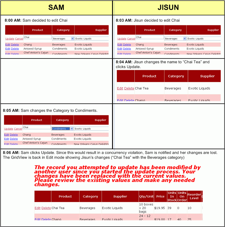 For example, imagine that two users, Jisun and Sam, were both visiting a page in our application that allowed visitors to update and delete the products through a GridView control. Both click the Edit button in the GridView around the same time. Jisun changes the product name to "Chai Tea" and clicks the Update button. The net result is an UPDATE statement that is sent to the database, which sets all of the product's updateable fields (even though Jisun only updated one field, ProductName). At this point in time, the database has the values "Chai Tea," the category Beverages, the supplier Exotic Liquids, and so on for this particular product. However, the GridView on Sam's screen still shows the product name in the editable GridView row as "Chai". A few seconds after Jisun's changes have been committed, Sam updates the category to Condiments and clicks Update. This results in an UPDATE statement sent to the database that sets the product name to "Chai," the CategoryID to the corresponding Beverages category ID, and so on. Jisun's changes to the product name have been overwritten. Figure 1 graphically depicts this series of events.