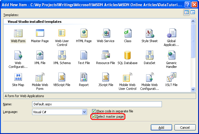 Figure 5: Add a New Web Form, Checking the Select master page Checkbox (Click to view full-size image)