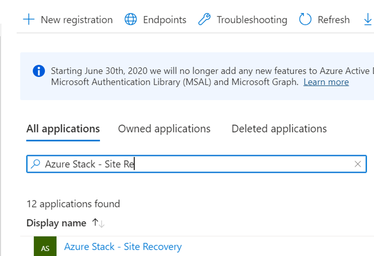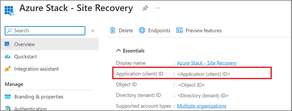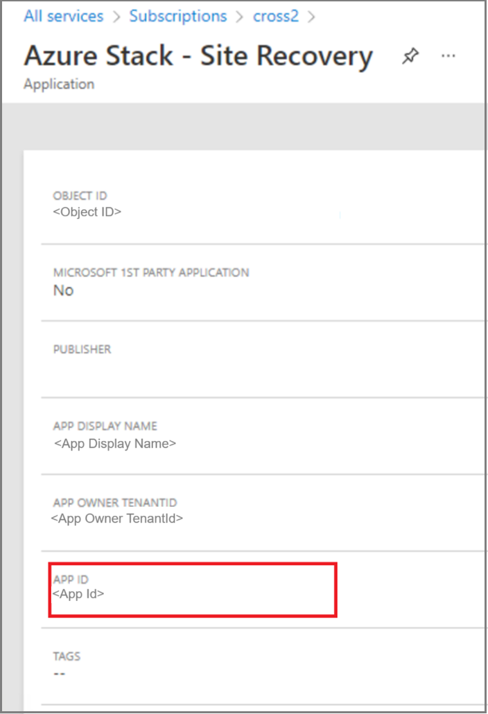 If you have multiple Azure Stack Hub stamps in same Microsoft Entra ID tenant, each stamp has an application ID with the same name. You must find the one in which the Application ID URL ends with the stamp's deployment ID. Alternatively, you can check the Manifest for the createDateTime tab, which needs to be the same as the Site Recovery installation time of the respective deployment.
