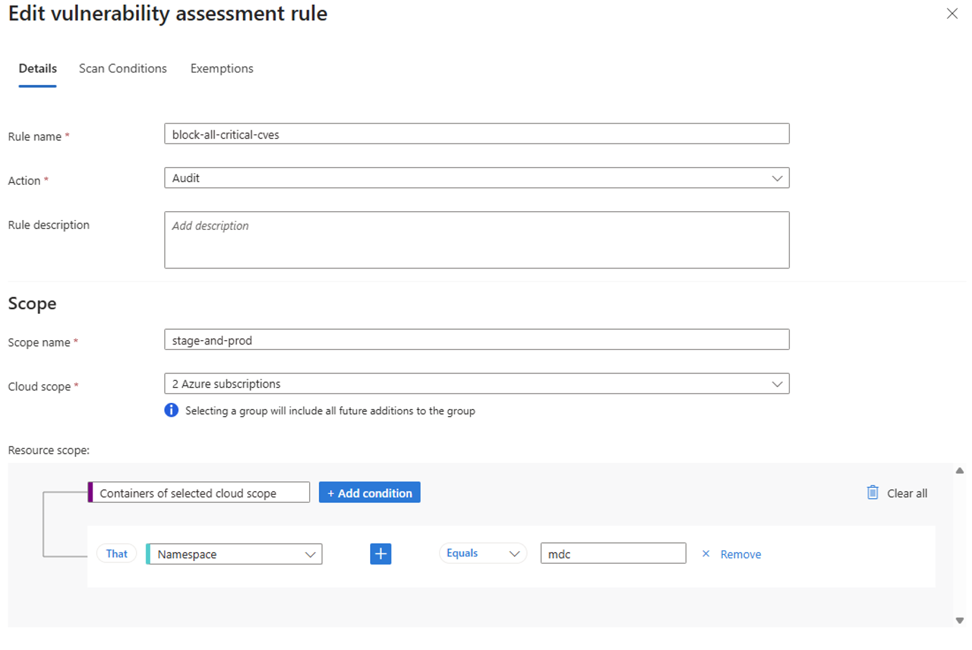 By default, after you enable the Defender plans and required extensions, the portal creates an audit rule that flags images with high or critical vulnerabilities.