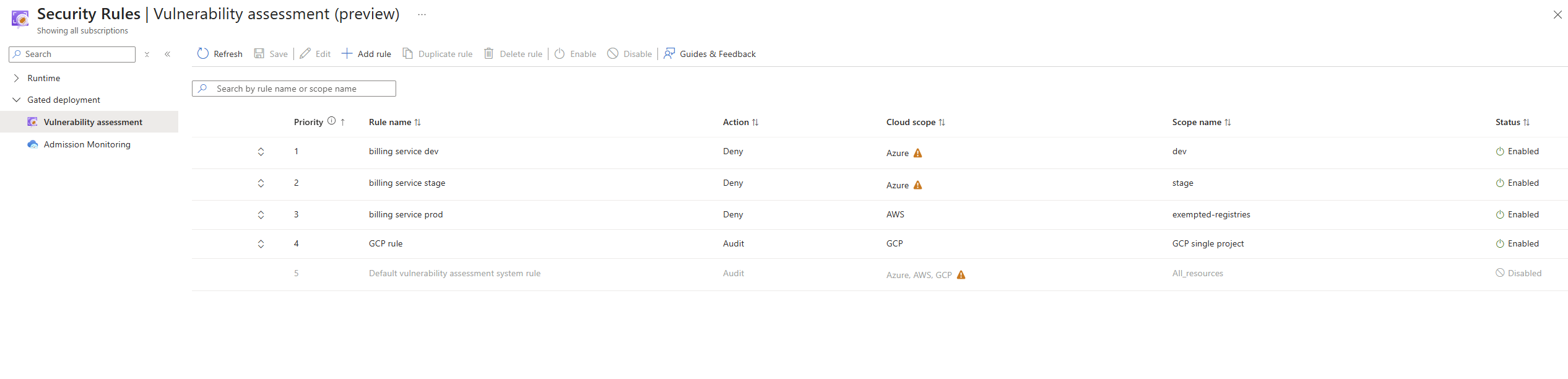 - Select Vulnerability Assessment to view a list of defined Gated Deployment security rules.