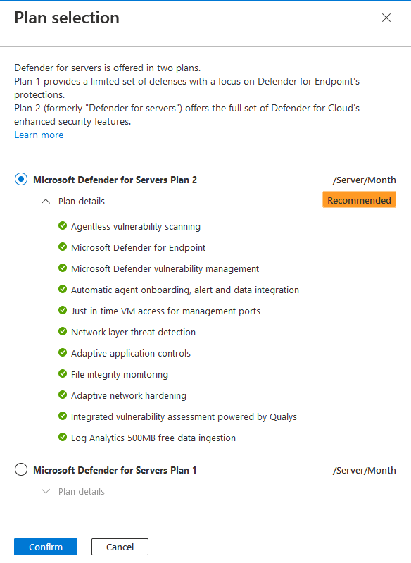 By default, this turns on Defender for Servers Plan 2. If you want to switch the plan, select Change plans.