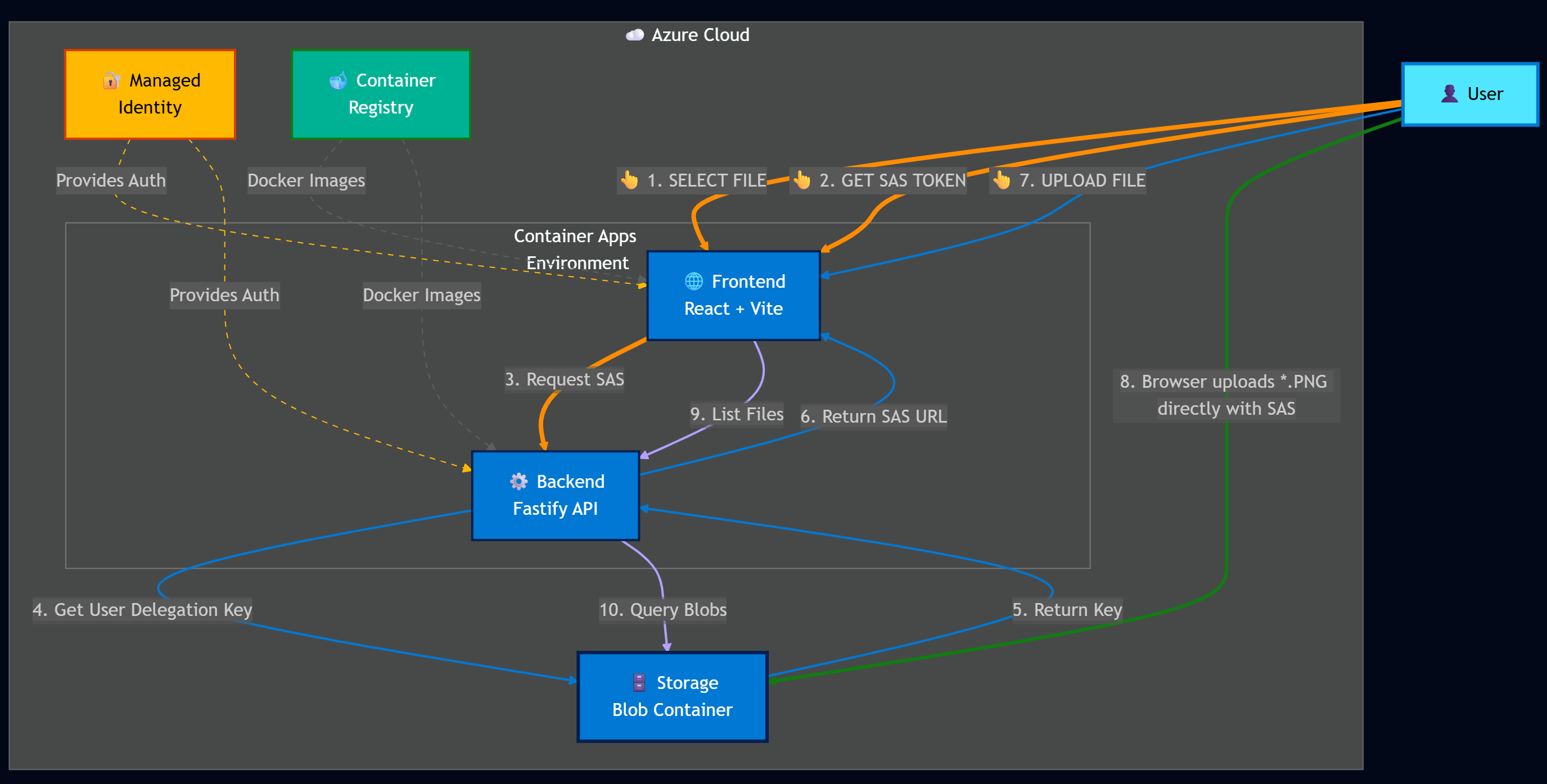 The frontend requests a SAS token from the API, then uploads files directly to Azure Storage. After upload, the API lists all uploaded files with read-only SAS tokens for display.