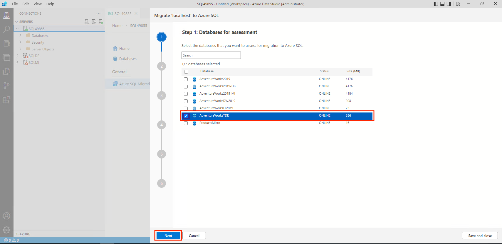 1. In Step 1: Databases for assessment in the Migrate to Azure SQL wizard, select the databases you want to assess. Then, select Next.