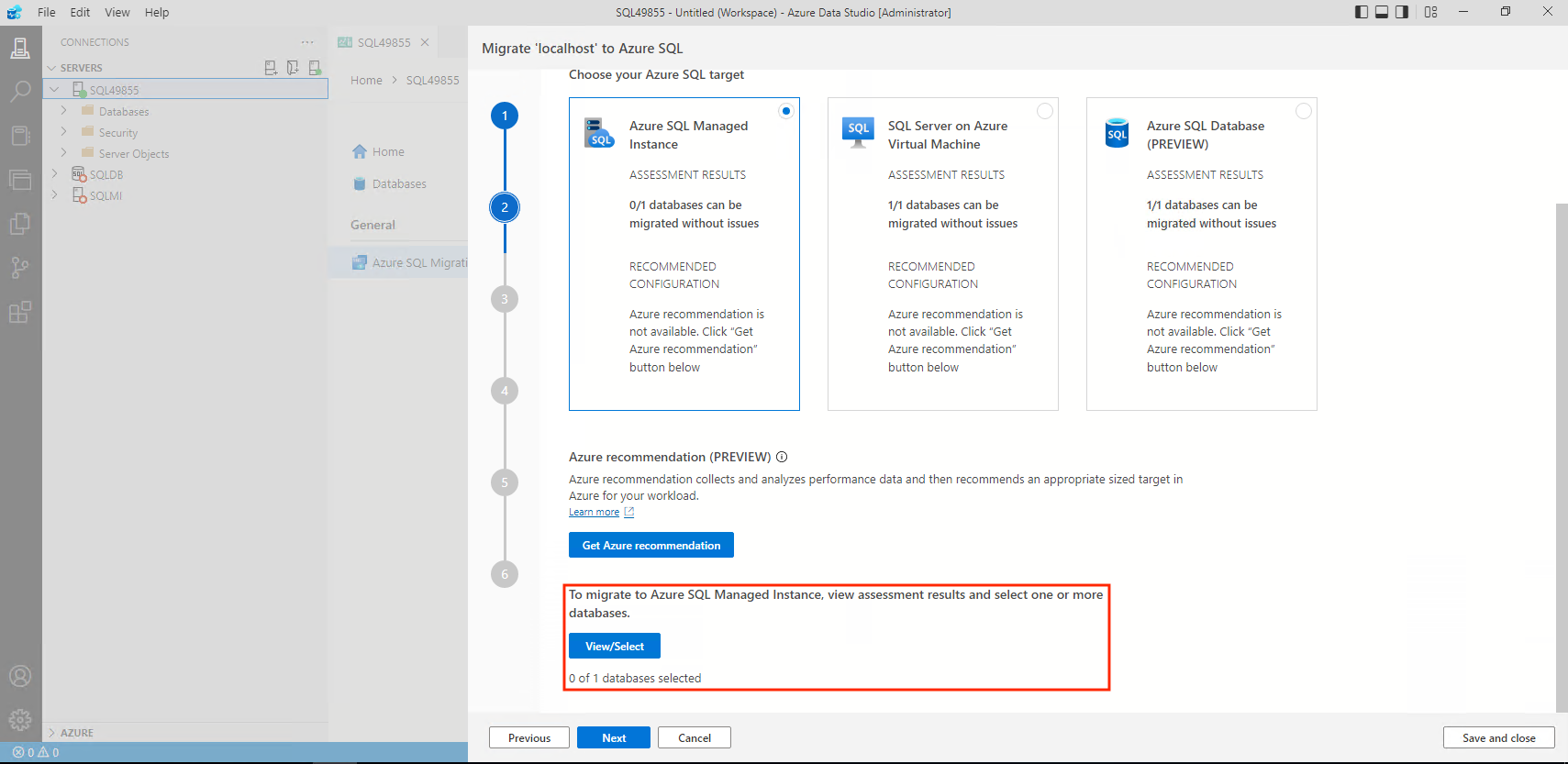 Screenshot that shows selecting a database for assessment.