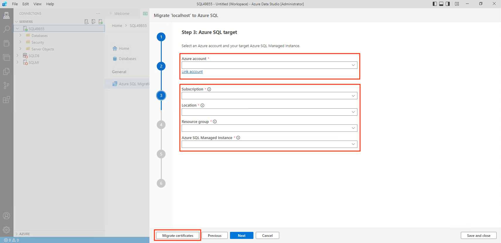 1. Select your Azure account, Azure subscription, the Azure region or location, and the resource group that contains the managed instance.