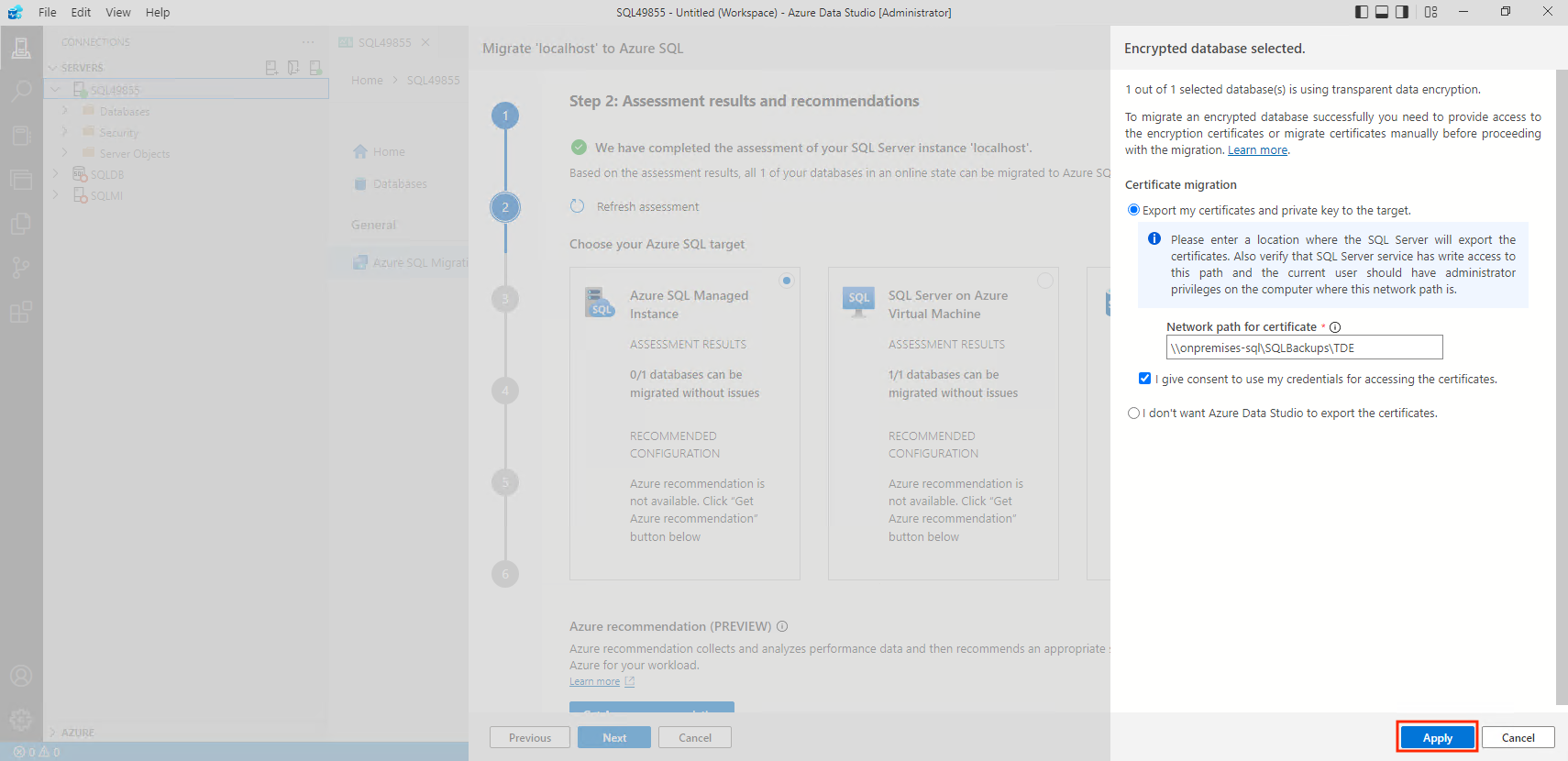 4. If you want to proceed with the TDE certification migration, select Apply.