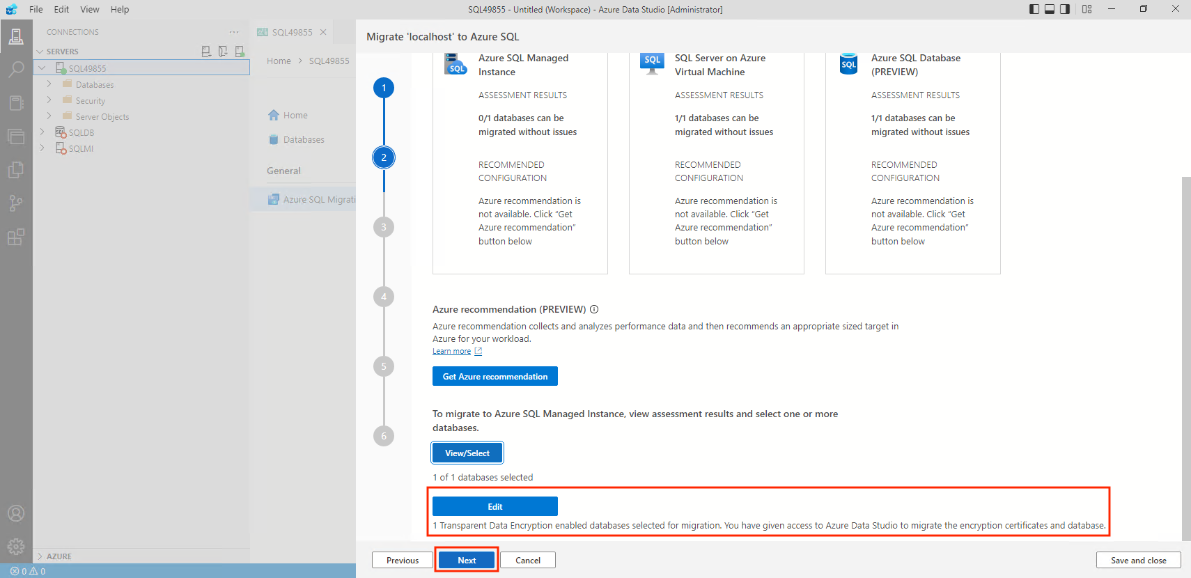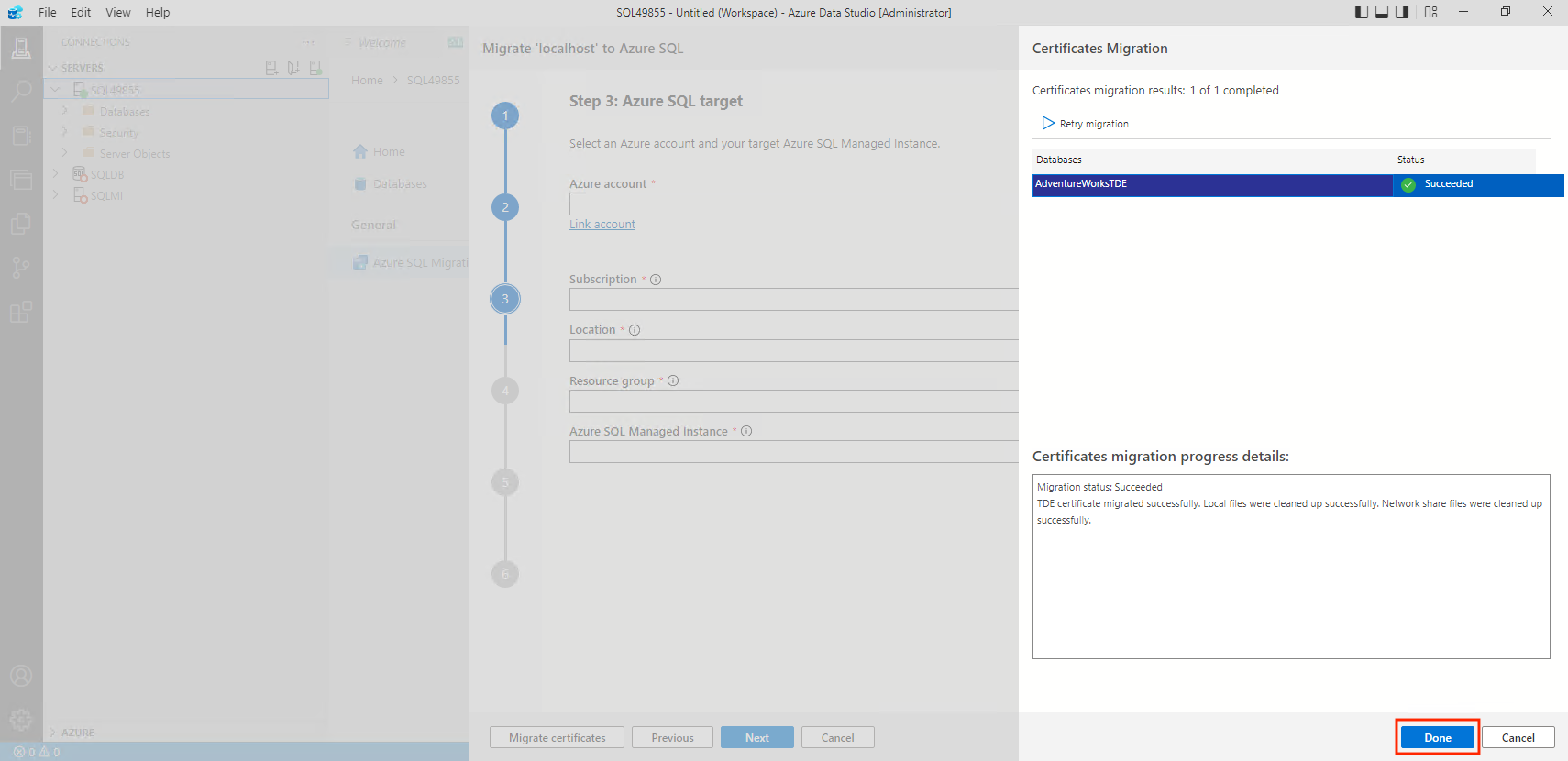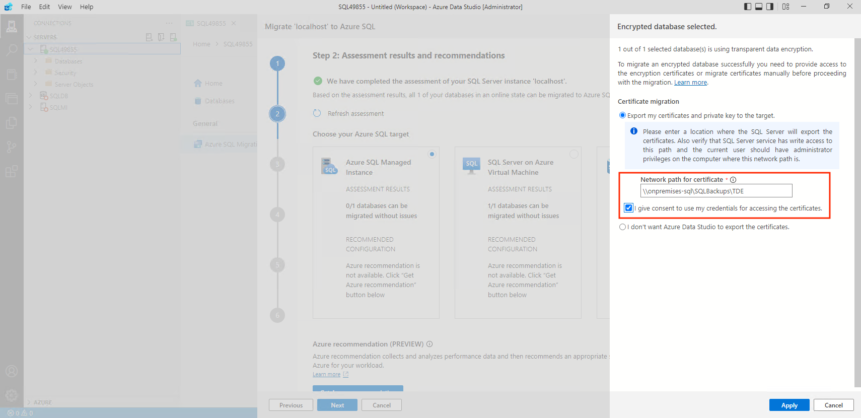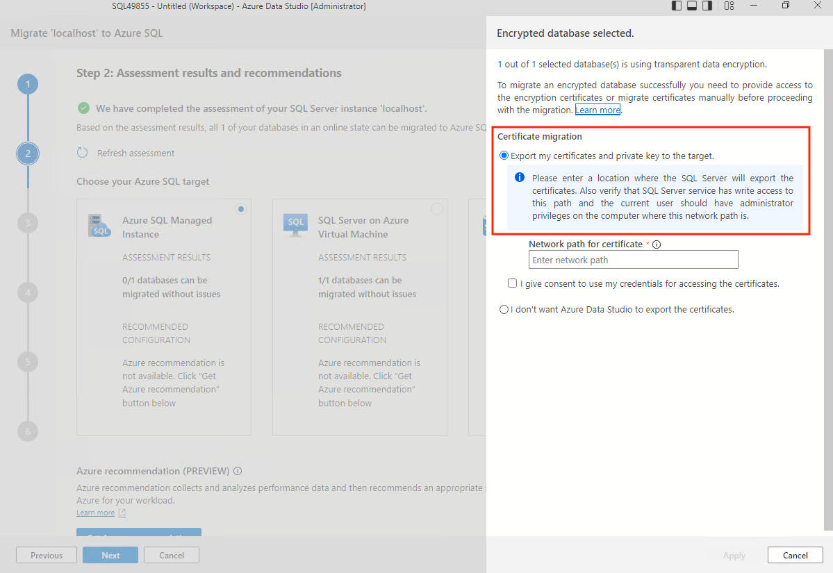 • The machine in which Azure Data Studio runs the TDE-enabled database migration should have connectivity to both sources and target SQL servers.
