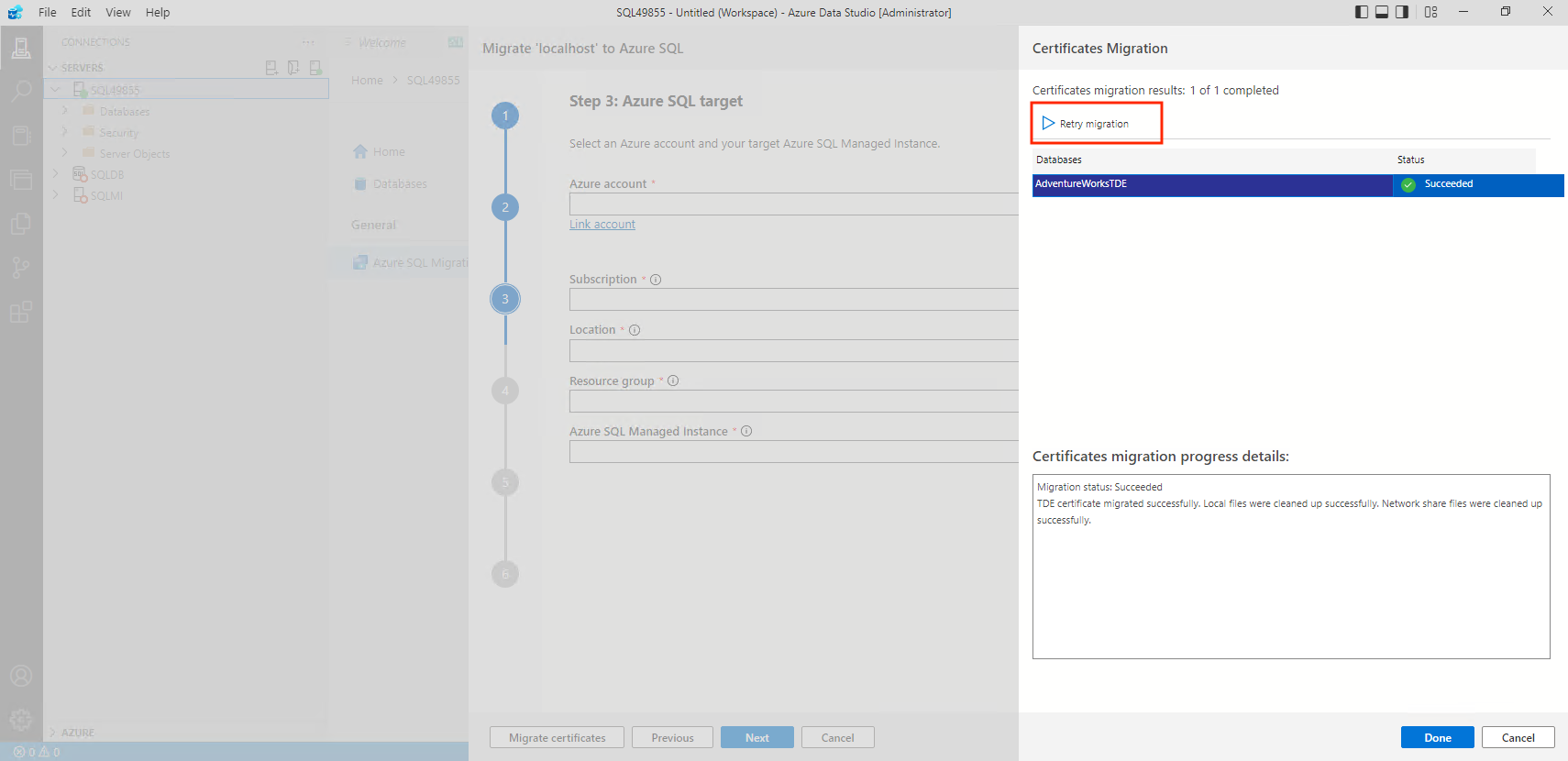 Screenshot that shows how to retry the TDE migration.
