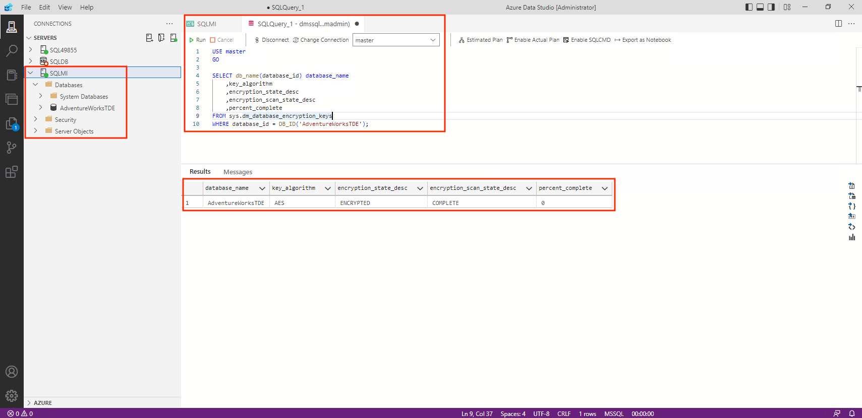Your target managed instance should now have the databases, and their respective certificates migrated. To verify the current status of the recently migrated database, copy and paste the following example into a new query window on Azure Data Studio while connected to your managed instance target. Then, select Run.