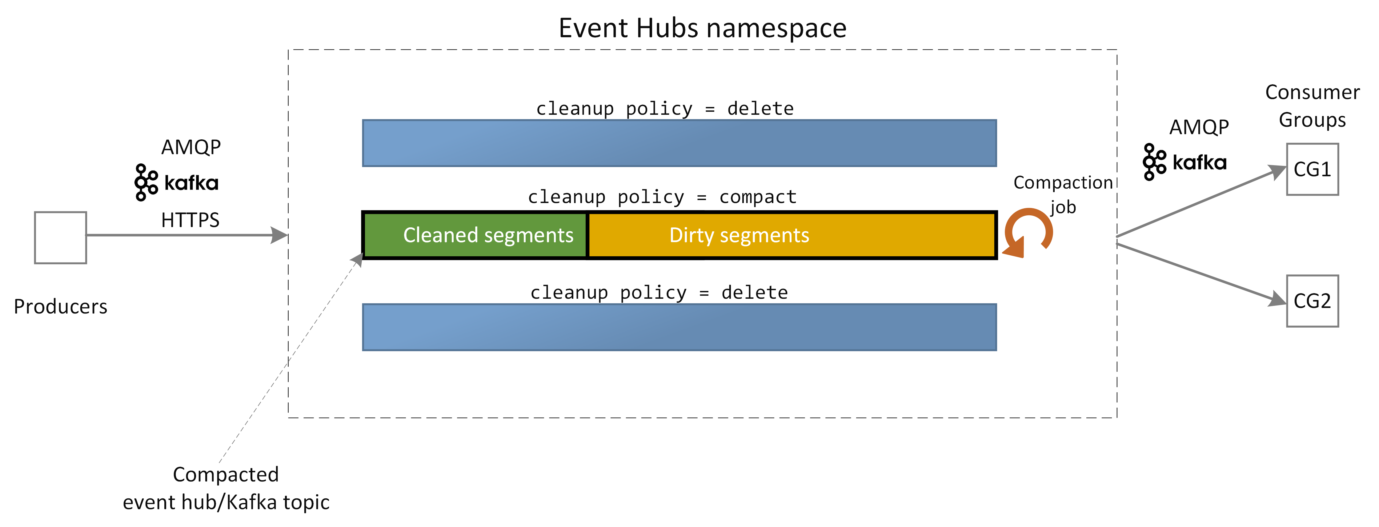 At any given time, the event log of a compacted event hub can have a cleaned portion and dirty portion. The clean portion contains the events that are compacted by the compaction job while the dirty portion comprises the events that are yet to be compacted.