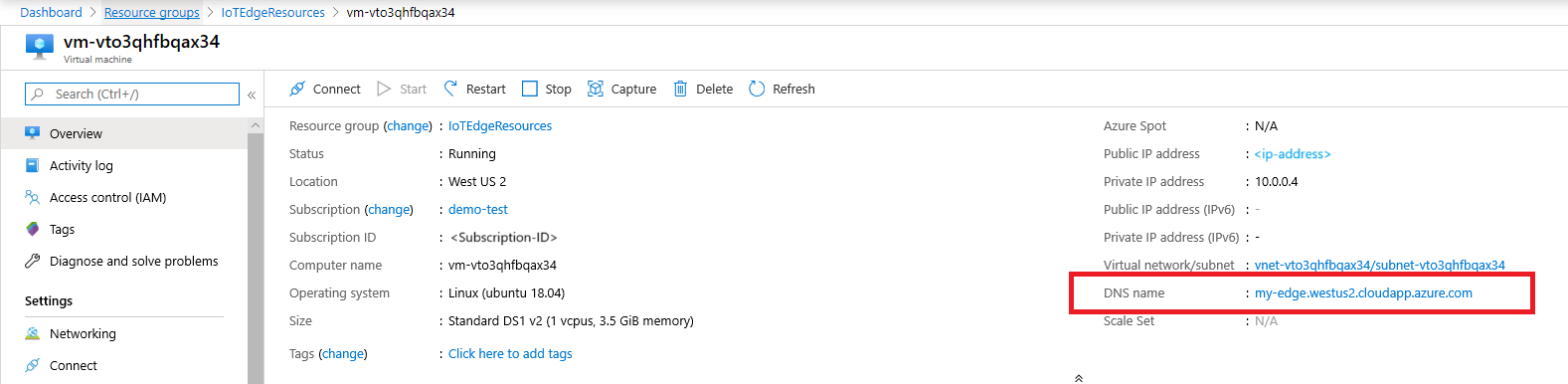 vm-0000000000000. Select the VM name, and on the VM Overview page, note the DNS name, which is in the format<dnsLabelPrefix>.<location>.cloudapp.azure.com.