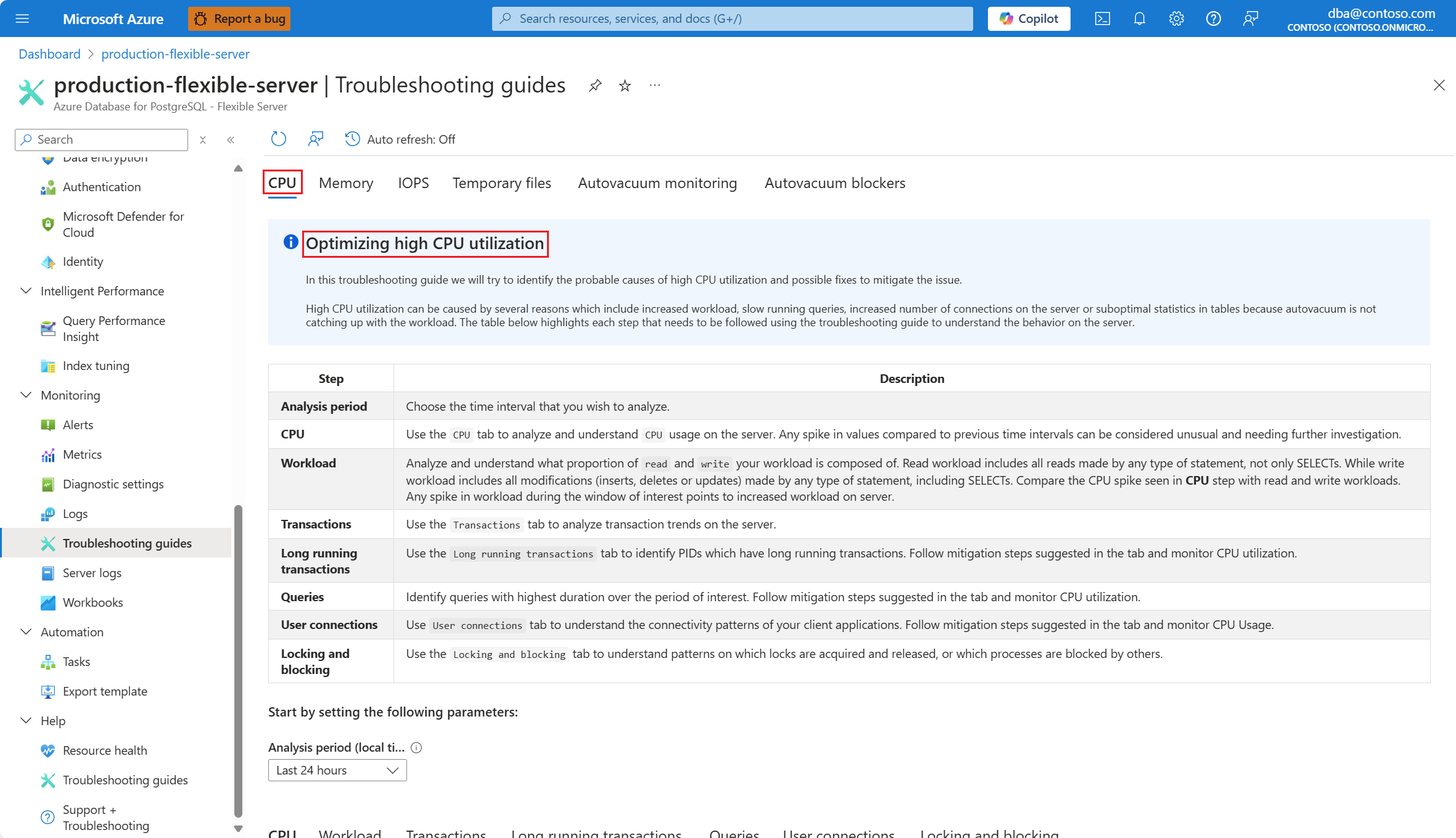 As soon as you're alerted by a CPU scenario, in the resource menu of the affected instance of Azure Database for PostgreSQL flexible server, under the Monitoring section, select Troubleshooting guides.