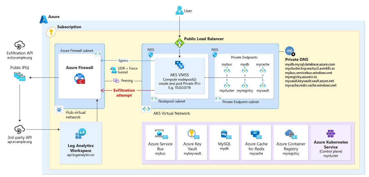 Network security groups at the subnet level of the compute resources restrict egress traffic. Forced tunneling is used to route all traffic through Azure Firewall. This approach helps provide a secure and isolated environment for your compute resources, which boosts protection for your data and applications.