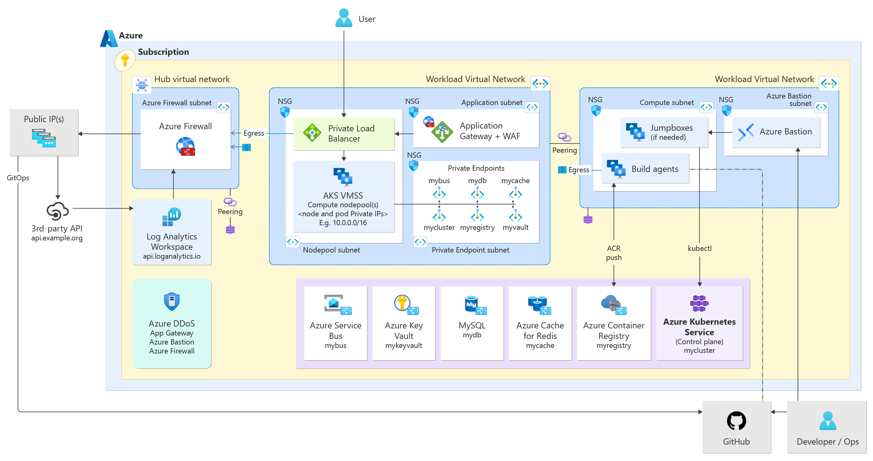 In a private network, there's no line of sight from the public internet to the workload. For the gateway, you can use a load balancer or firewall. These options can provide security assurances.
