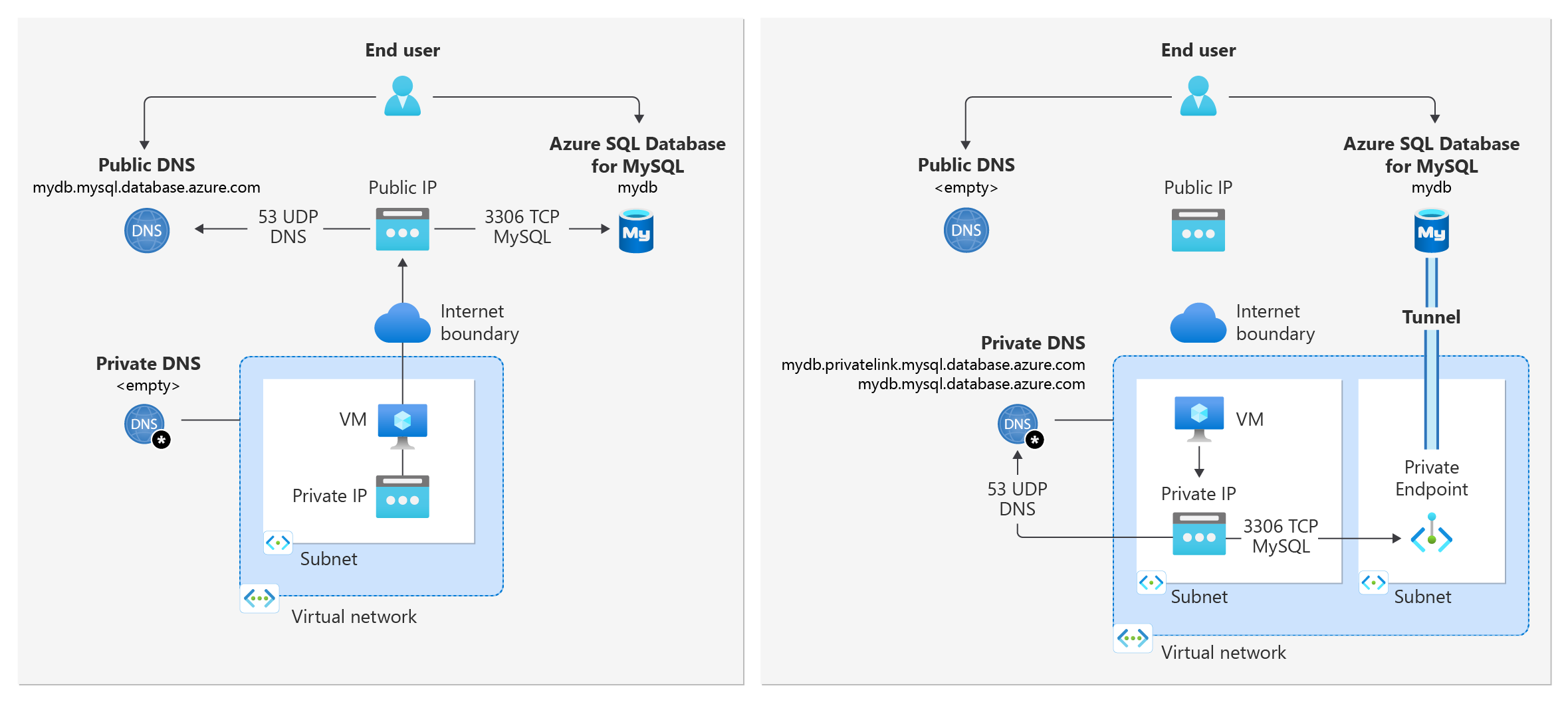 In this example, the image on the left shows the flow for publicly exposed endpoints. On the right, that flow is secured by using private endpoints.