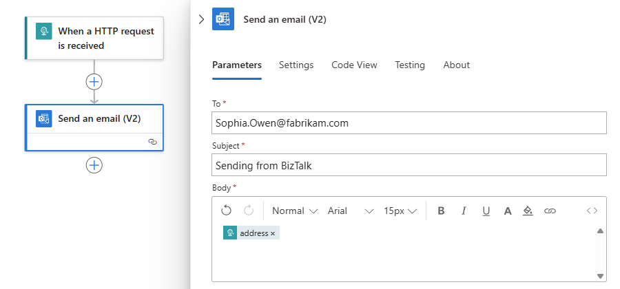 Property Description To Enter your Office 365 email address. Subject Enter Sending from BizTalk. Body Select inside the edit box. When the lightning and function icons appear, select the lightning icon to open the dynamic content list. From the list, under When a HTTP request is received, select the trigger output that you want to include in the email. Your workflow looks similar to the following example: