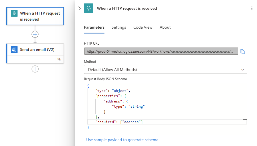 This step automatically creates an endpoint URL, which appears in the Request trigger. You can send HTTP requests to this URL, which trigger or cause the workflow to start running.