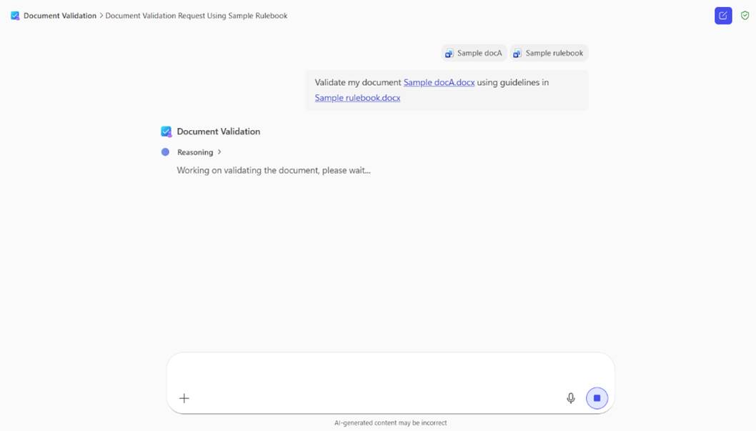 - Chat med din agent, og upload et dokument, du vil validere. Du behøver ikke at angive regelbøger i chatten, når du bruger en tilpasset agent.