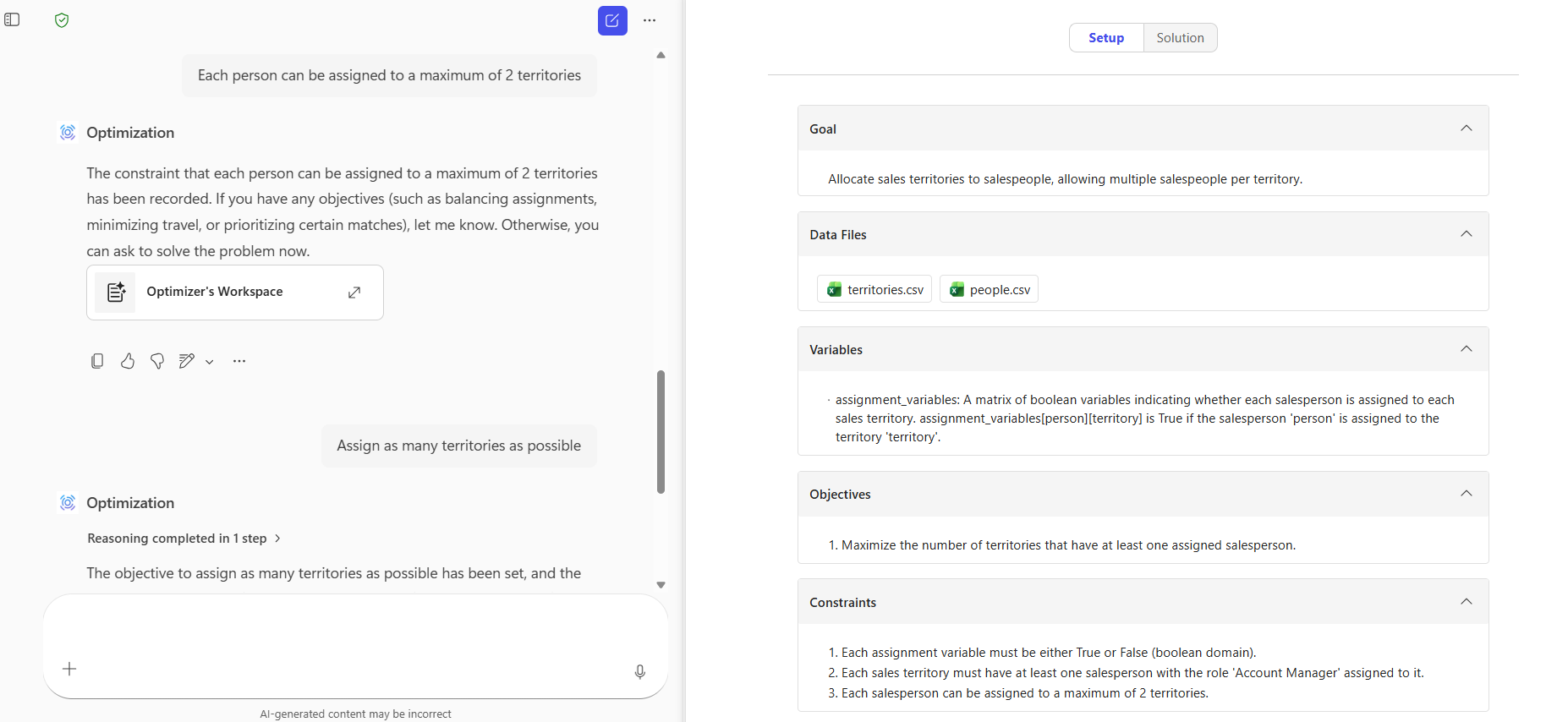 Agenten genererer automatisk beslutningsvariabler, der repræsenterer tildelingsvalg. Den beregner optimale værdier og viser resultaterne i et format, der er let at forstå.