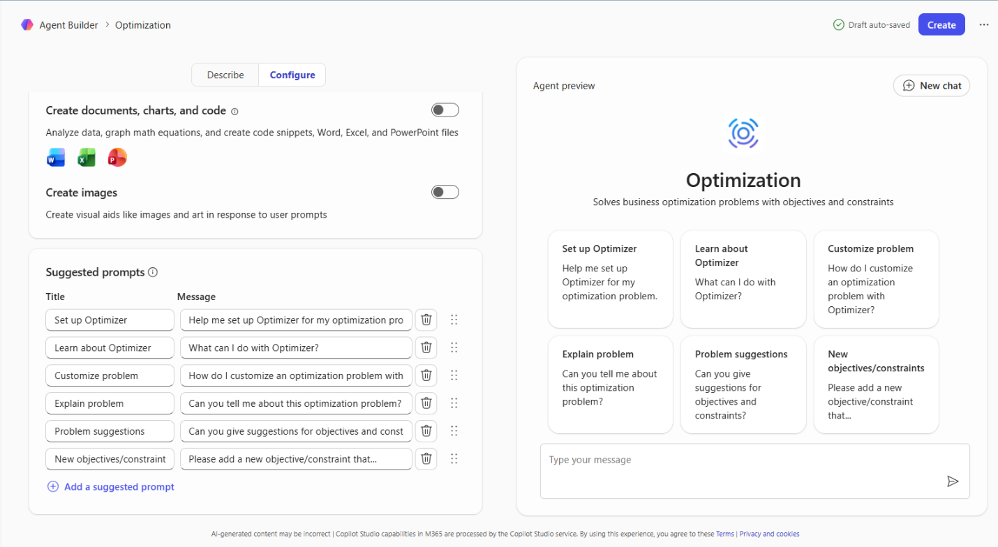Ved hjælp af en tilpasset kontekstagent kan du gemme et brugerdefineret optimeringsproblem til genbrug på tværs af organisationen. Agenten husker din problemstruktur, herunder mål, begrænsninger, målsætninger og dataskema.
