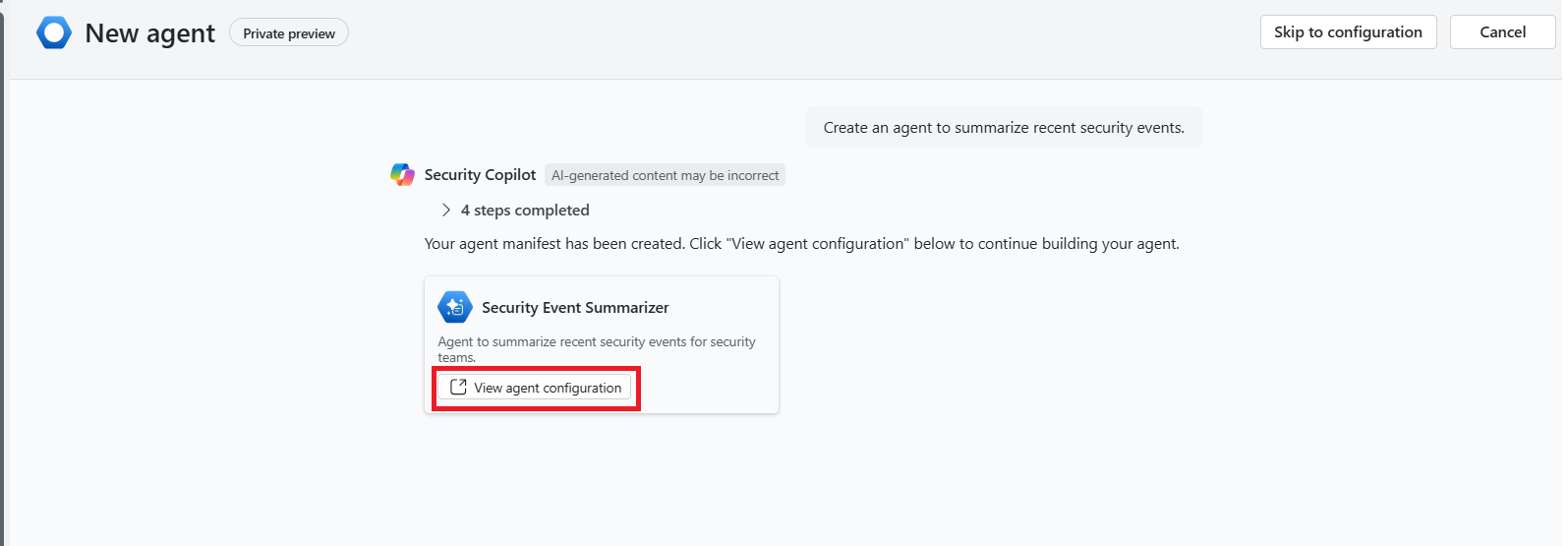 If you're satisfied with the agent that Security Copilot created, confirm that you want to proceed. The agent is then created for you. In this example, a Security Event Summarizer agent is being created. You can converse with Security Copilot to customize your agent as needed.