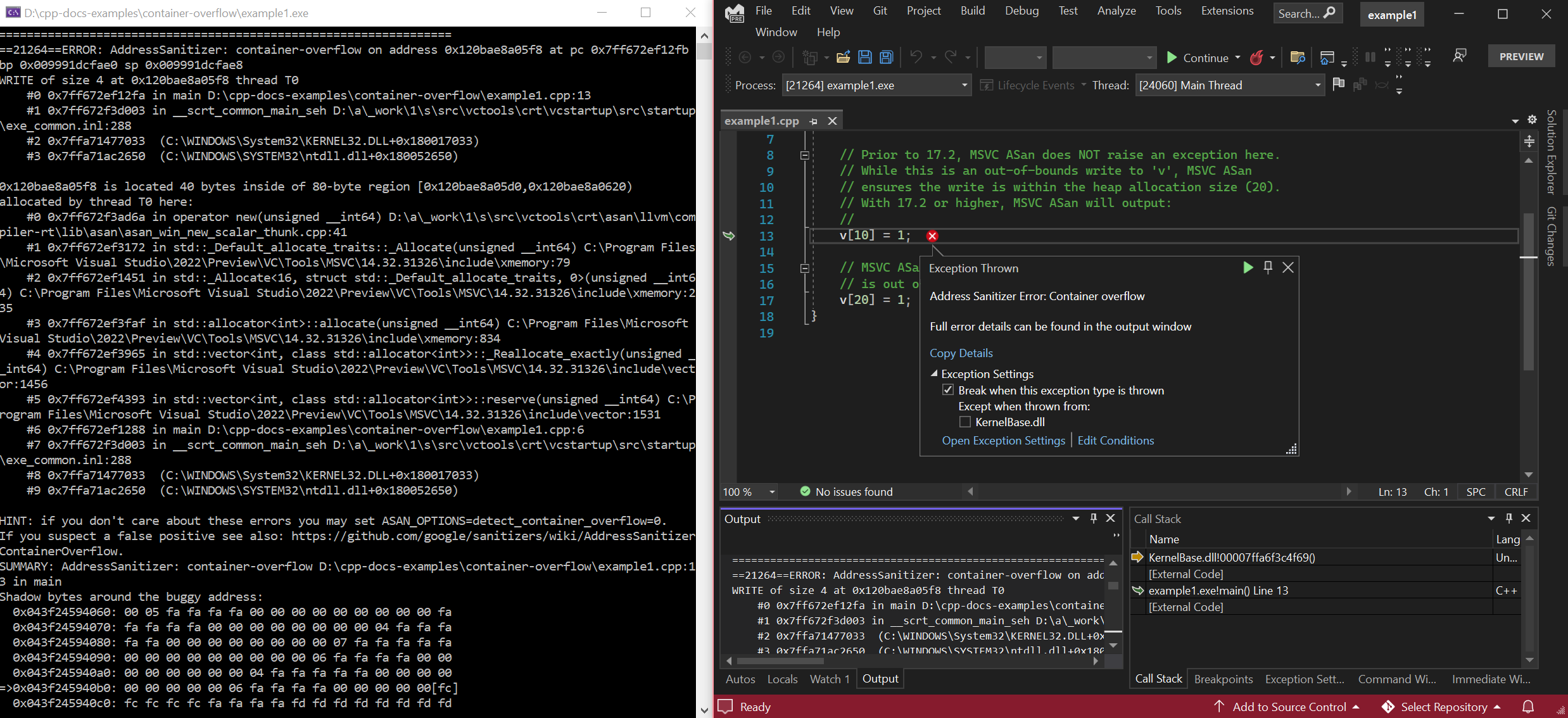In Visual Studio 2022 version 17.2 and later, the Microsoft Visual C++ standard library (STL) is partially enlightened to work with the AddressSanitizer. The following container types have annotations to detect memory access issues:
