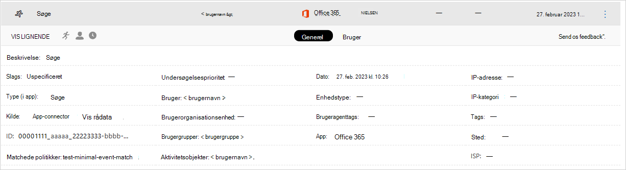 Du kan få vist flere oplysninger om hver aktivitet ved at vælge selve Aktiviteten i aktivitetsloggen. Dette åbner skuffen Aktivitet, der indeholder følgende yderligere handlinger og indsigter for hver aktivitet:
