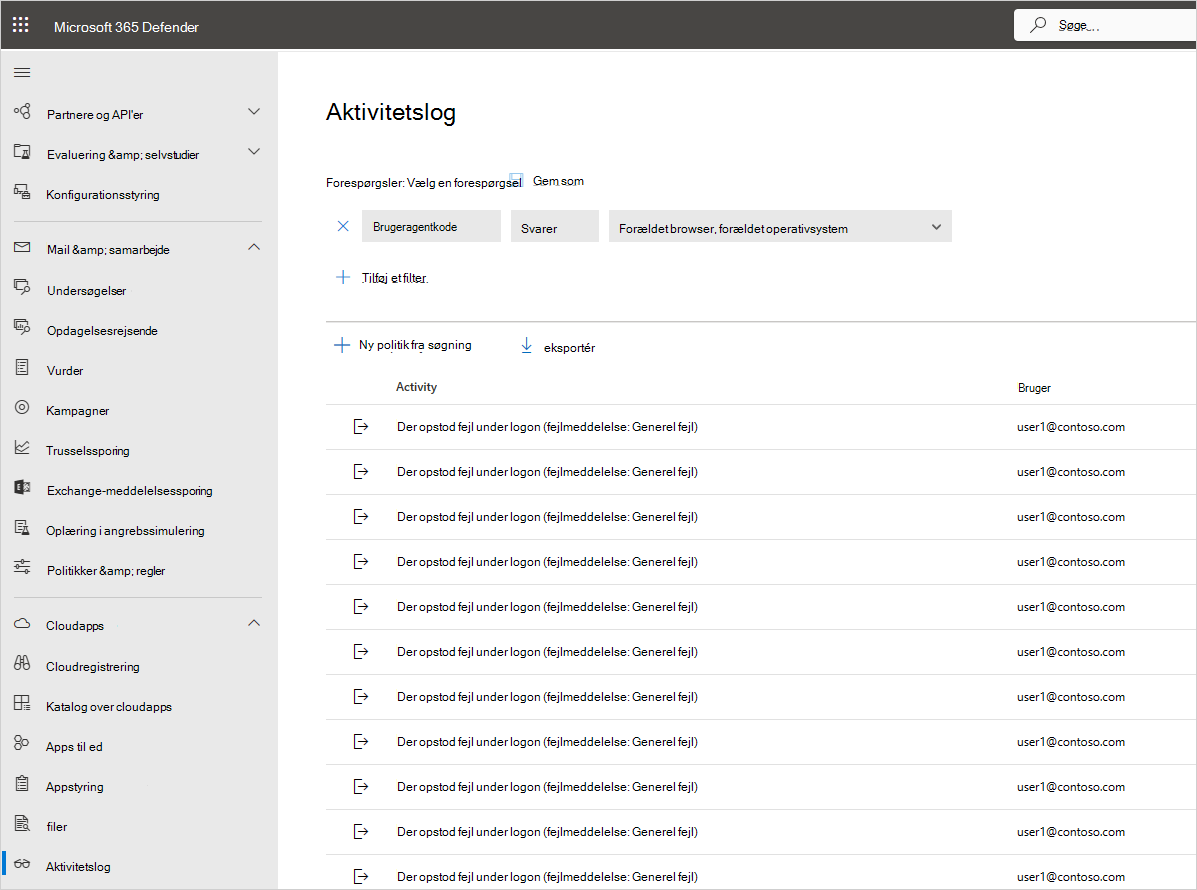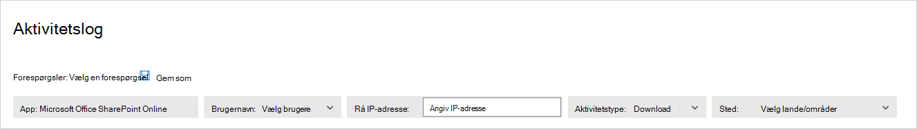Aktivitetsloggen kan filtreres, så du kan finde bestemte aktiviteter. Du opretter politikker baseret på aktiviteterne og definerer derefter, hvad du vil have besked om og reagere på. Du kan søge efter aktiviteter, der udføres på bestemte filer. Typen af aktiviteter og de oplysninger, vi får for hver aktivitet, afhænger af appen, og hvilken type data appen kan levere.