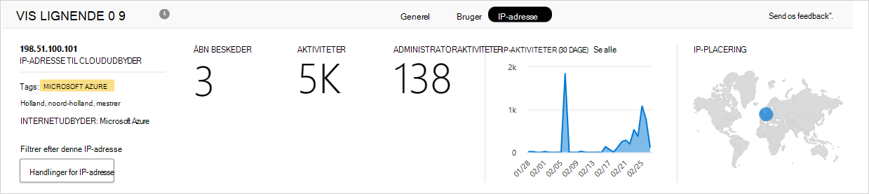 Da IP-adresseoplysninger er afgørende for næsten alle undersøgelser, kan du få vist detaljerede oplysninger om IP-adresser i aktivitetsskuffen. Fra en bestemt aktivitet kan du vælge fanen IP-adresse for at få vist konsoliderede data om IP-adressen, herunder antallet af åbne beskeder for den bestemte IP-adresse, en tendensgraf over seneste aktivitet og et placeringskort. Det gør det f.eks. nemt at foretage detailudledning, når det er umuligt at undersøge rejsebeskeder. Derudover kan du nemt forstå, hvor IP-adressen blev brugt, og om den var involveret i mistænkelige aktiviteter. Du kan også udføre handlinger direkte i IP-adresseskuffen, der gør det muligt for dig at mærke en IP-adresse som risikable, VPN eller firma for at lette fremtidig undersøgelse og politikoprettelse.