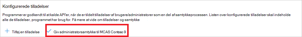 Hver gang du tilføjer tilladelse, skal du vælge Giv administratorsamtykke , for at den nye tilladelse kan træde i kraft.