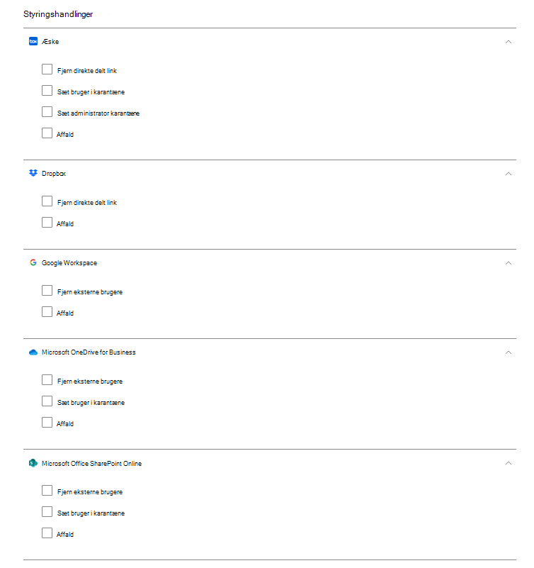 | Filpolitik og Filer | Filer | Sæt administrator karantæne | Fjerner eventuelle tilladelser fra filen og flytter filen til en karantænemappe på en placering for administratoren. Denne handling gør det muligt for administratoren at gennemse filen og fjerne den. | Microsoft 365 SharePoint, OneDrive for Business, Box |