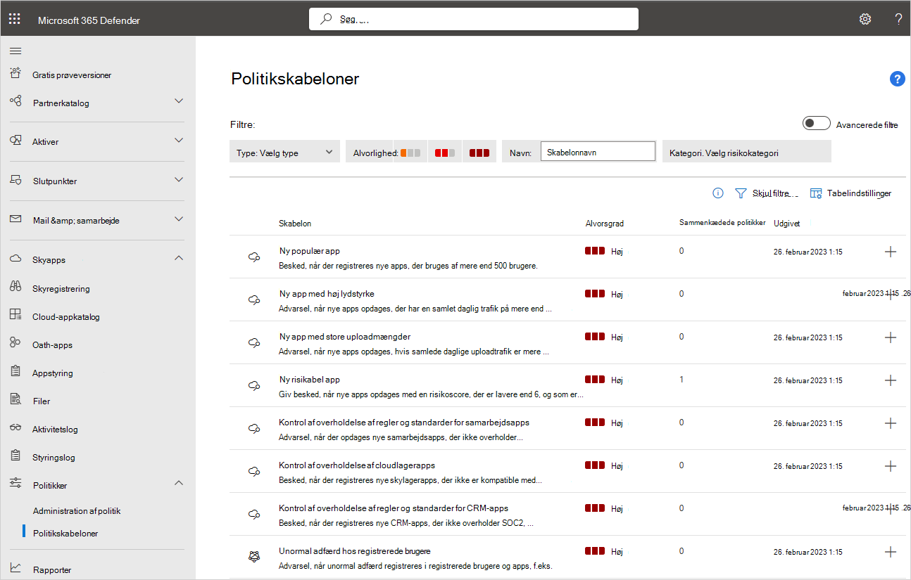 Hvis du vil se en komplet liste over politikskabeloner, skal du gå til Politikker –>Politikskabeloner under Cloud apps på portalen Microsoft Defender. Det kan f.eks. være: