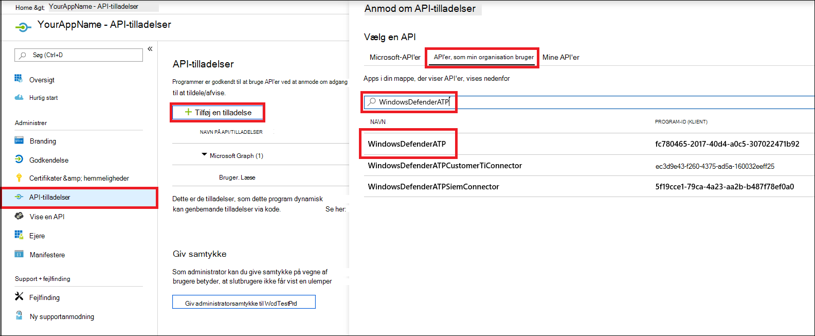 På din programside skal du vælge API-tilladelser>TilføjtilladelseS-API'er, som min organisation bruger>, skriver WindowsDefenderATP og vælger WindowsDefenderATP.>