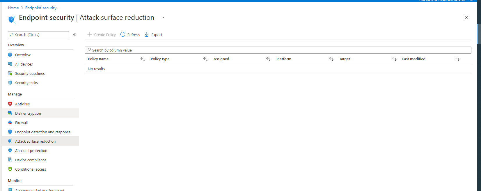Åbn Microsoft Intune Administration, og naviger tilstartslutpunkt> sikkerhed >Angreb overfladereduktion.