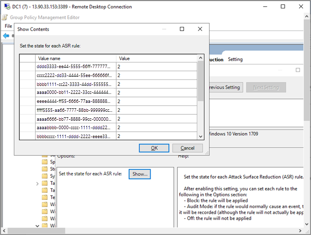 Hent den aktuelle liste over GUID'er for regler til reduktion af angrebsoverfladen fra installation af regler for reduktion af angrebsoverflade trin 3: Implementer ASR-regler. Du kan finde flere oplysninger om regler under Reference til regler for reduktion af angrebsoverflade