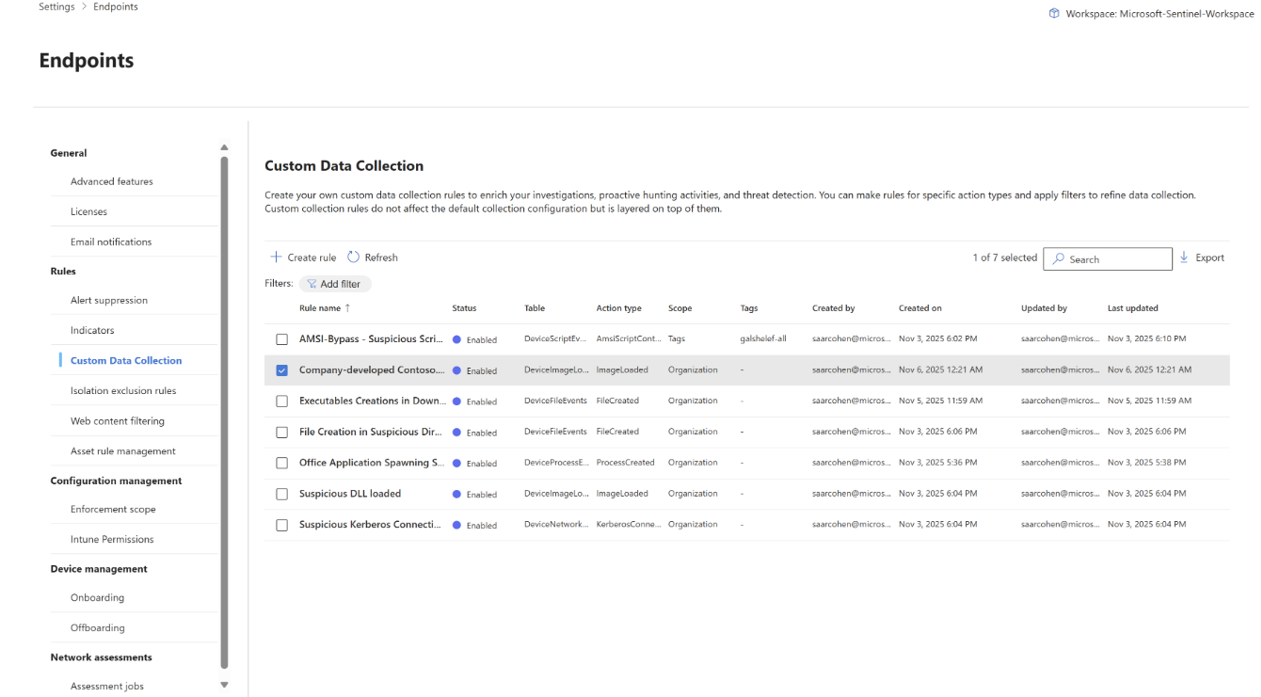 Brugerdefineret dataindsamling (prøveversion) gør det muligt for organisationer at udvide og tilpasse telemetriindsamling ud over standardkonfigurationer for at understøtte specialiserede behov for trusselsjagt og sikkerhedsovervågning. Denne funktion gør det muligt for sikkerhedsteams at definere specifikke samlingsregler med skræddersyede filtre til hændelsesegenskaber, f.eks. mappestier, procesnavne og netværksforbindelser.