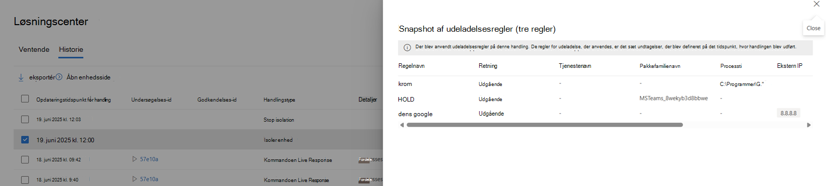 Isolationsudeladelse henviser til muligheden for at udelukke bestemte processer, IP-adresser eller tjenester fra netværksisolation ved at anvende den selektive handling for isolationssvar på enheder.