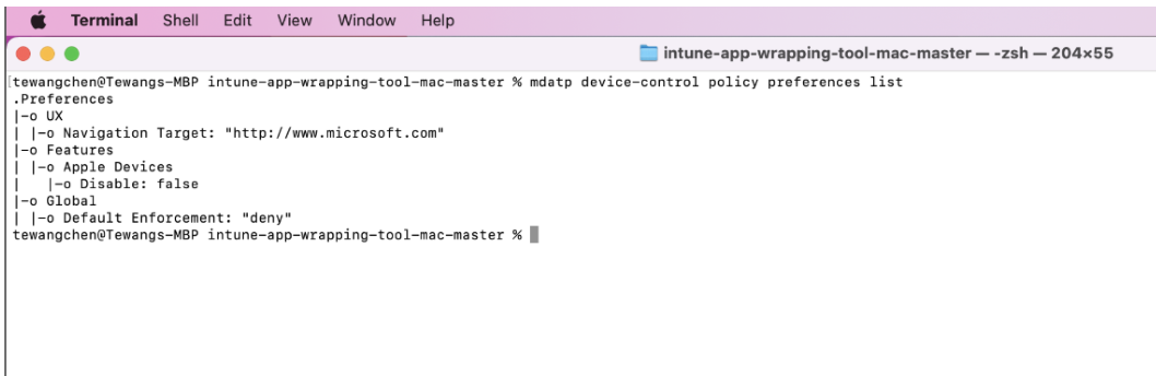 Svar: Kør listen over indstillinger for enhedsstyring for mdatp for at få vist alle iOS-politikker på denne computer: