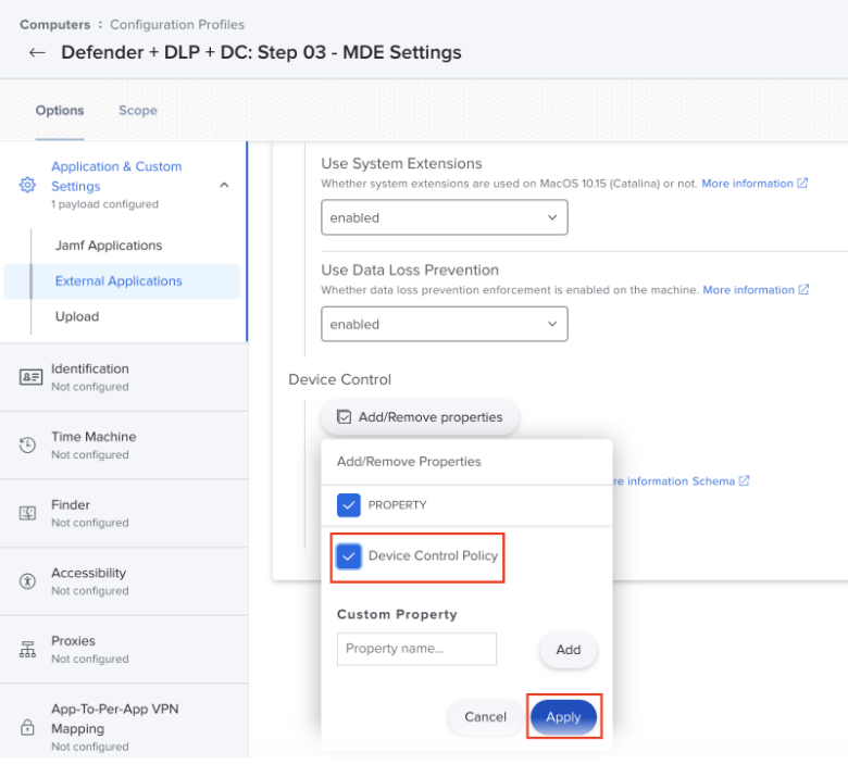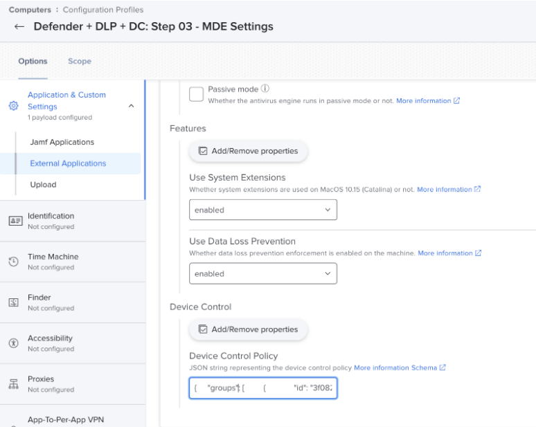 Skemaet for indstillingerne for Defender for Endpoint indeholder den nye deviceControl/policy nøgle. Den eksisterende konfigurationsprofil for Defender for Endpoint-indstillinger skal opdateres, så den bruger indholdet i den nye skemafil.