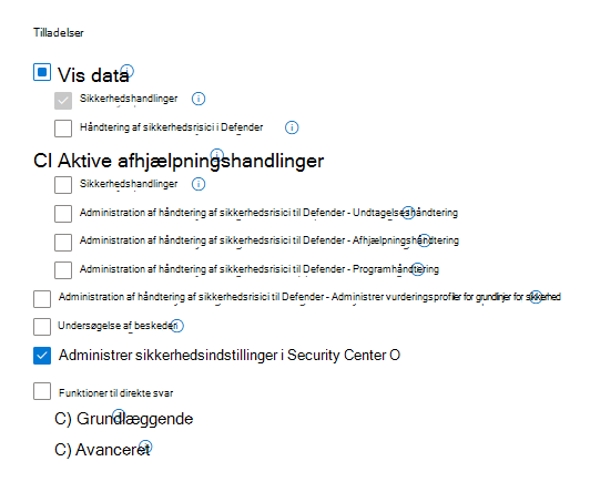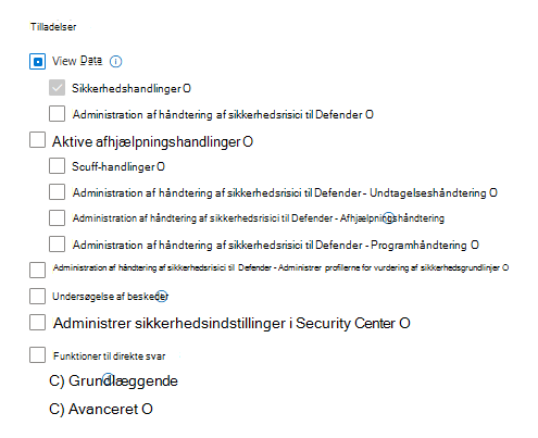 Skriv roller (herunder roller, der ikke er begrænset til alle enhedsgrupper). Defender-tilladelser: Grundlæggende sikkerhedsdata (under Sikkerhedshandlinger). Entra ID roller: Global læser, Sikkerhedslæser. |