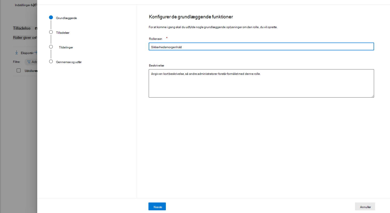 Skriv et rollenavn, og vælg derefter Næste for Tilladelser.