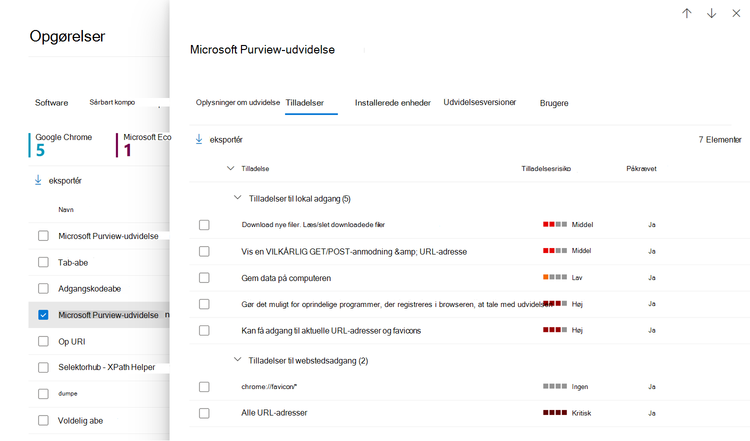 Kolonnerne Anmodede tilladelser og Tilladelsers risiko indeholder mere specifikke oplysninger om antallet af tilladelser, der anmodes om af udvidelsen, og niveauet for tilladelsernes risiko baseret på den type adgang til enheder eller websteder, der anmodes om.