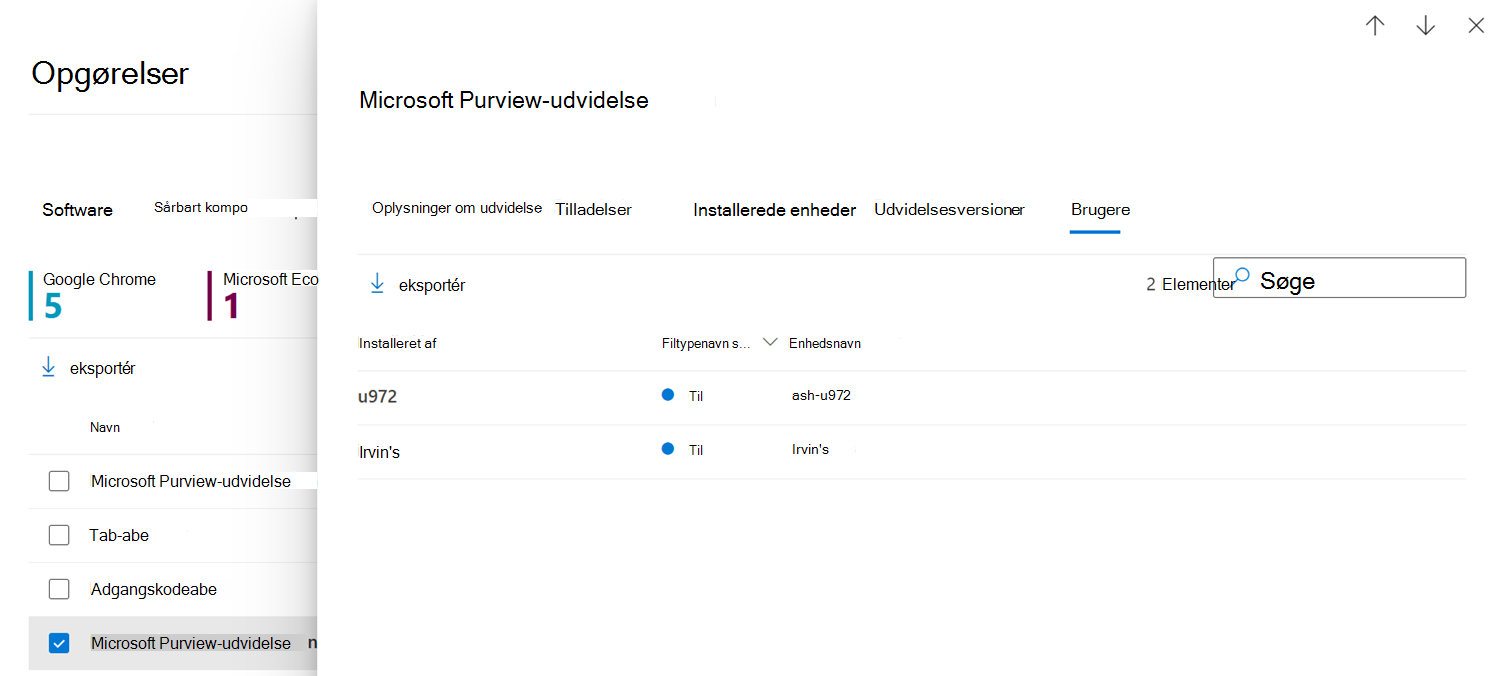Herfra kan du søge efter en bestemt enhed, som udvidelsen er installeret på, og du kan eksportere en liste over enhederne til en csv-fil.