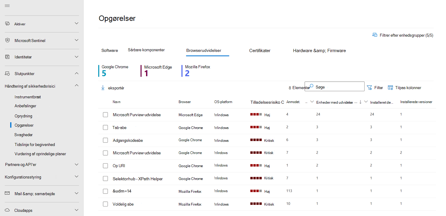 Siden Browserudvidelser åbnes med en liste over de browserudvidelser, der er installeret på tværs af din organisation, herunder oplysninger om udvidelsesnavnet, browseren, antallet af enheder, udvidelsen er installeret på, og antallet af enheder, hvor udvidelserne er slået til.