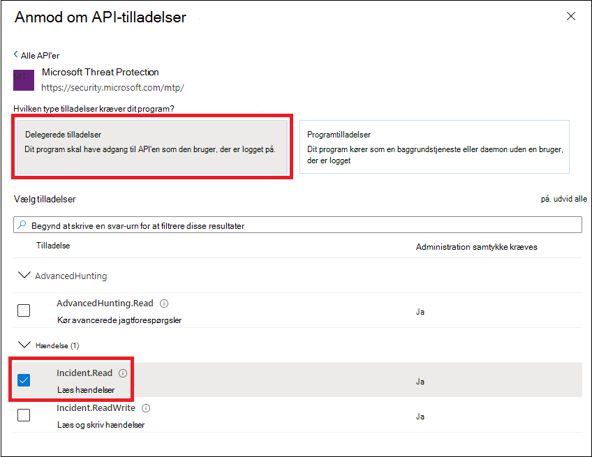 Vælg Delegerede tilladelser. Vælg de relevante tilladelser til dit scenarie ( f.eks. Incident.Read), og vælg derefter Tilføj tilladelser.
