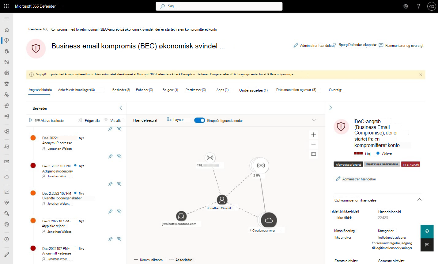 Den Defender XDR hændelsesside afspejler de automatiske angrebsafbrydelser via angrebshistorien og den status, der er angivet af en gul linje (Figur 1). Hændelsen viser et dedikeret afbrydelsesmærke, fremhæver status for de aktiver, der er indeholdt i hændelsesgrafen, og føjer en handling til Løsningscenter.