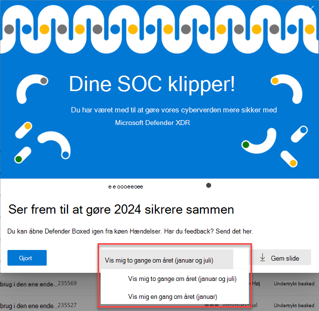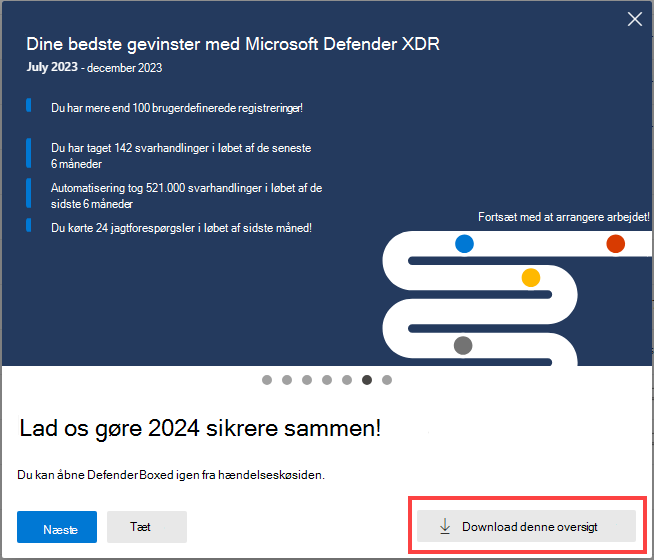 I en begrænset periode i løbet af januar og juli hvert år vises Defender Boxed automatisk, når du åbner hændelseskøen første gang. Defender Boxed fremhæver din organisations sikkerhedssucces, forbedringer og svarhandlinger i løbet af de forrige seks måneder eller kalenderåret.